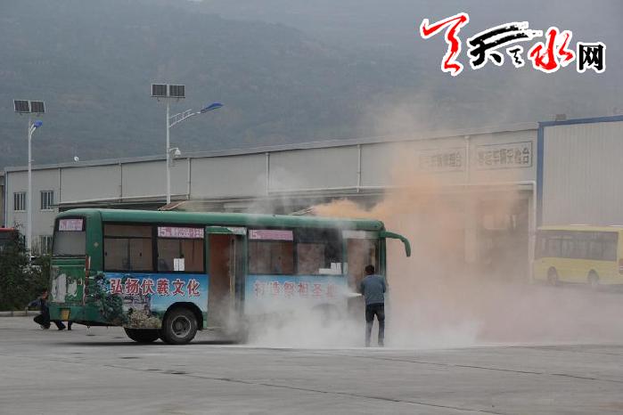 公交车突发火灾应急处置演练在中心客运站停车场进行,本环节主要检验了公交驾驶员对突发事件的应急处置能力。演练中,一辆正在行驶的公交车辆突然发生火灾,车辆上方浓烟滚滚,驾驶员立即将车平稳停靠在路边,打开应急门,紧急疏散车内乘客到安全区域,并立刻报警,同时向集团安全应急小组报告了情况,采取现场灭火措施。最终在各方努力下,火被扑灭,受伤乘客及时送到医院进行救治,火灾具体原因正在调查。