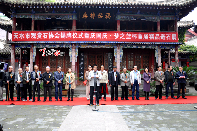 中国观赏石协会为天水市观赏石协会发来贺电表示热烈祝贺,认为天水市观赏石协会揭牌暨首届精品奇石展的举办意义重大,必将对弘扬天水奇石文化起到积极的推动作用。中国观赏石协会副会长、甘肃观赏石协会会长胡云华,中国观赏石协会副会长、甘肃观赏石协会常务副会长郑忠,甘肃省观赏石协会副会长王跟兰亲临会展,指导本次石展工作。郑忠副会长在揭牌仪式讲话中说,天水首届精品奇石展中有闻名全国的庞公石,有丰富多彩的渭河石,有全国各地的其他石种,其范围之广、规模之大、精品之多,在天水是空前的。
