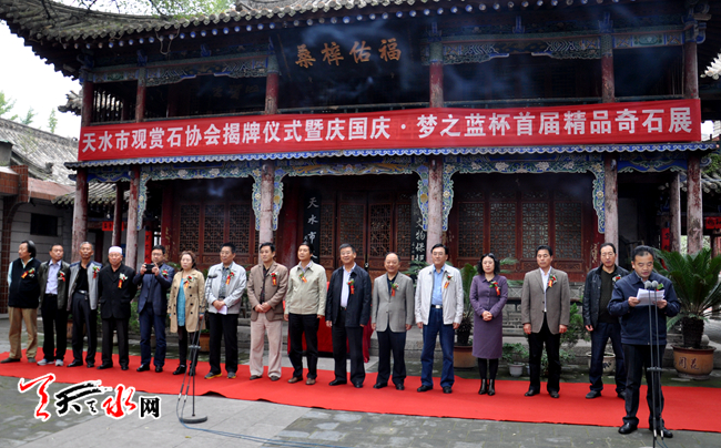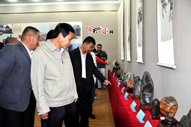 市人大常委会副主任赵建强、市委常务副秘书长仙松涛、市委宣传部副部长王小熊、市文广新局局长刘锋、市旅游局局长王燕出席了天水市观赏石协会揭牌暨首届精品奇石展开展仪式。