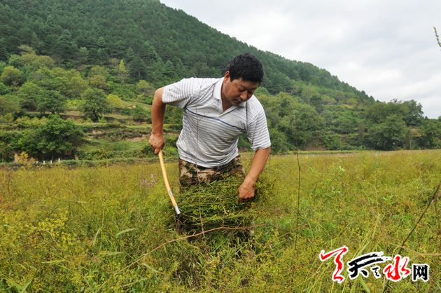 9月20日,麦积区利桥乡的一整片坡地上,成片成片的柴胡长得郁郁葱葱。今年40多岁的赵旭东正在地里收割已经成熟的柴胡。