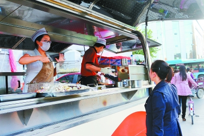 高校毕业生李玲(左一)用小额贷款购买流动餐车经营特色小吃。今年,天水市麦积区人社局通过小额贷款促进大学生创业。截至目前,该区共为414名高校毕业生每人申请创业小额贷款10万元。本报通讯员丁榕