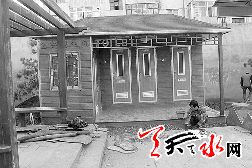 天天天水网讯【记者常亮】10月21日下午,记者在秦州区重新街北口的仿古长廊处看到,仿古长廊的一角,几位施工人员正在安装便民公厕。