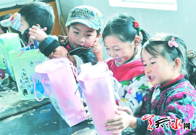 看着叔叔阿姨送来的礼物,孩子们脸上洋溢着灿烂的笑容。