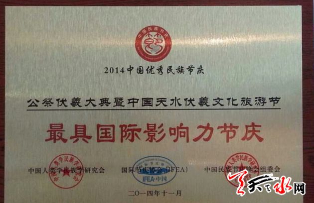 天天天水网讯【记者 王晓馨】11月5日,记者从天水市节会办了解到,在近日召开的第五届中国民族节庆峰会暨2014“中国优秀民族节庆”颁奖盛典上,公祭伏羲大典暨中国天水伏羲文化旅游节获得“最具国际影响力节庆”奖项。