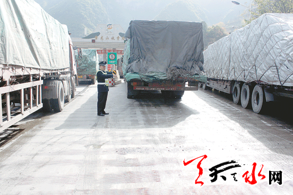 天天天水网讯 11月3日,天水公路管理局金龙山收费所工作人员指挥载重货车依次经过收费站。