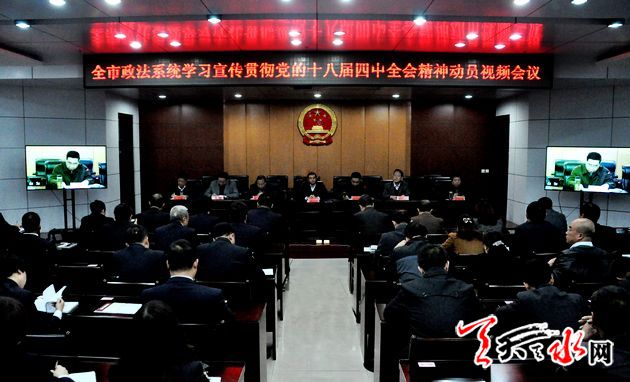 天天天水网讯(记者 李欣桐)11月6日,天水市政法系统召开学习宣传贯彻党的十八届四中全会精神视频动员会,会议学习传达了市委常委扩大会议和省委政法委通知精神,安排部署了全市政法系统学习贯彻党的十八届四中全会精神各项工作。市委常委、政法委书记赵卫东要求,全市各级政法部门和广大政法干警要以这次动员会议为契机,立即行动起来,在学习宣传贯彻党的十八届四中全会精神上走在前列、做出表率,努力为建设法治天水、和谐天水提供有力的法治保障。