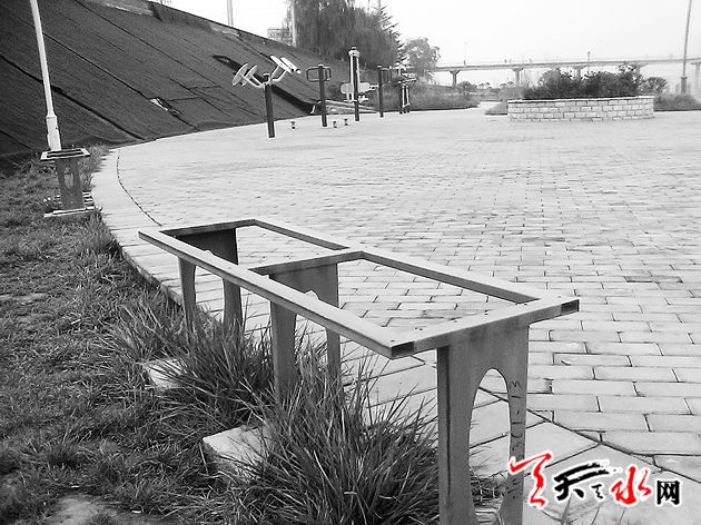 天天天水网麦积讯【记者贾敏 实习生马丽】11月10日下午,记者在麦积区华龙小区附近的渭河风景线上看到,人行道上的12个公共座椅中有8个上面的木条被拆掉,只剩下光秃秃的铁架子摆在那里,不仅没有起到服务市民的作用,反而影响市容。