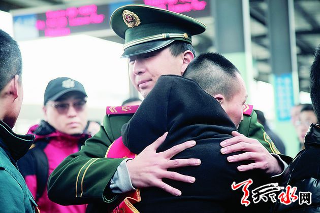 11月25日,在天水火车站站台,天水市公安消防支队20名光荣退伍的消防老兵与战友依依话别。