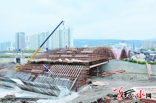 11月27日,在秦州区双桥藉河大桥项目施工现场,施工人员正在加紧施工。