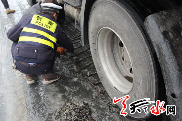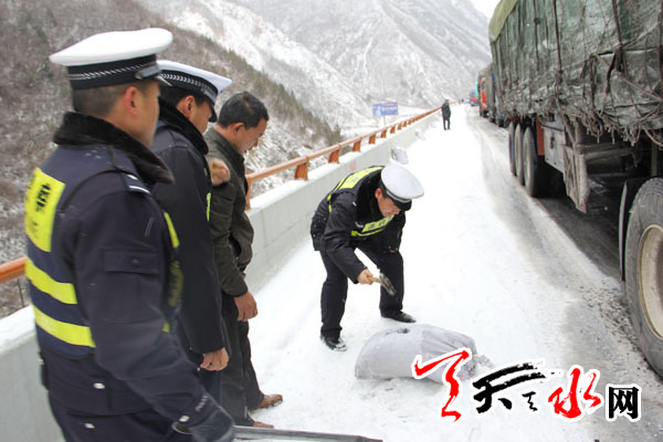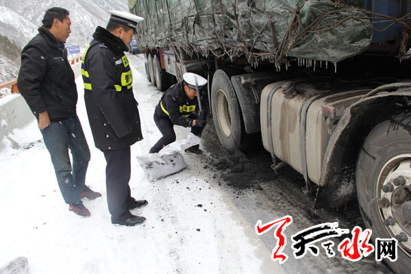 天天天水网讯【通讯员 任明 张明军】2014年12月9日,天水地区遭遇了第一场低温降雪和冰冻灾害天气,玉泉大队辖区部分路面积雪结冰,严重影响了道路交通安全,同时,也给交通保畅工作带来了严峻挑战,尤其老虎沟大桥路面因与地面相比温差较大,路面积雪结冰,难以正常通行。为了尽快疏通路面,确保车辆安全通行,大队全体民警在领导班子的带领下,严格按照支队、大队恶劣天气管理工作要求,克服困难,顽强拼搏,风雪无阻,持续战斗在恶劣天气的第一线,积极投入到抗冰雪、保畅通的各项工作中去,谱写了一曲曲动人的赞歌。