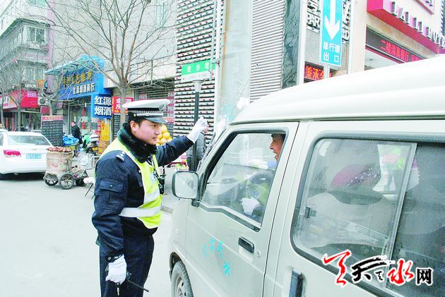 12月22日,在秦州区进步巷口,民警正在劝阻驾驶员驶离单行道出口。