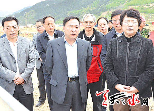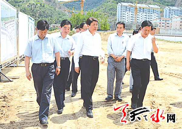 ▲水利部副部长蔡其华在省水利厅厅长魏宝君陪同下检查秦州区娘娘坝灾后重建工作