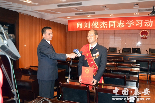 授奖仪式上,省检察院宣传处处长王瑞成宣读了最高人民检察院表彰决定;省检察院党组成员、政治部主任张学军给刘俊杰颁发了证书、证章;市委政法委副书记陈明达宣读了全市政法系统《向刘俊杰同志学习的决定》;市委常委、政法委书记赵卫东,市检察院党组书记、代检察长张喜分别作了讲话。