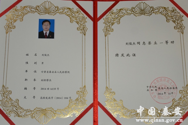 秦安县检察院刘俊杰被最高检授予“一等功”荣誉称号