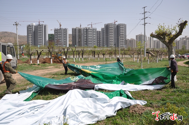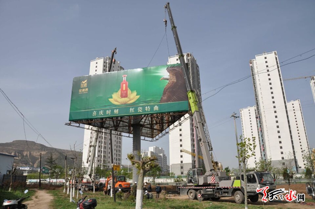 4月20日,天水市建设局(综合执法局)、甘肃省交警总队和省高速公路管理局等单位联合对天宝高速公路天水西收费站附近的8块3000多平方米的立柱式广告牌进行了拆除,这些广告牌涉及到秦州区国投公司、兰州天美宏广告公司、秦安金录广告服务中心等公司和个人。在拆除现场记者看到,硕大的广告牌被吊机吊起,施工人员从立柱中部切割,不到半小时,硕大的三角形广告牌便悄然落地。
