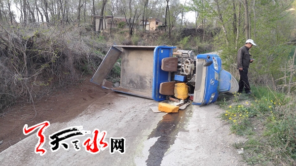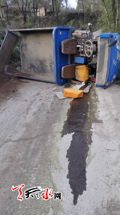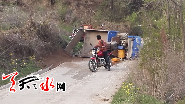 天天天水网4月20日18时50分讯【记者杨晓斌】秦州区皂郊镇谢崖村路口,一辆拉沙的农用三轮车横卧在村口的马路上,三轮车侧翻后,沙子洒在道路两旁。事故发生后,附近村民立即对受伤的驾驶员施救,车辆暂时横卧于路中央。