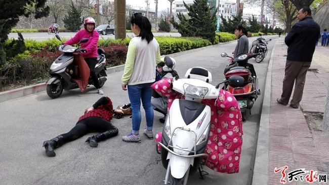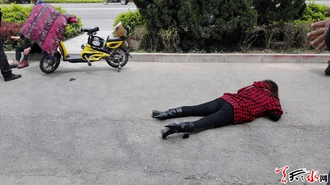 天天天水网21日11时讯【记者蔚军平】4月21日11时许,在秦州区羲皇大道森美家具广场附近,一位骑电动车的老人与一名骑着电动车逆行的妇女在非机动车道上发生相撞。