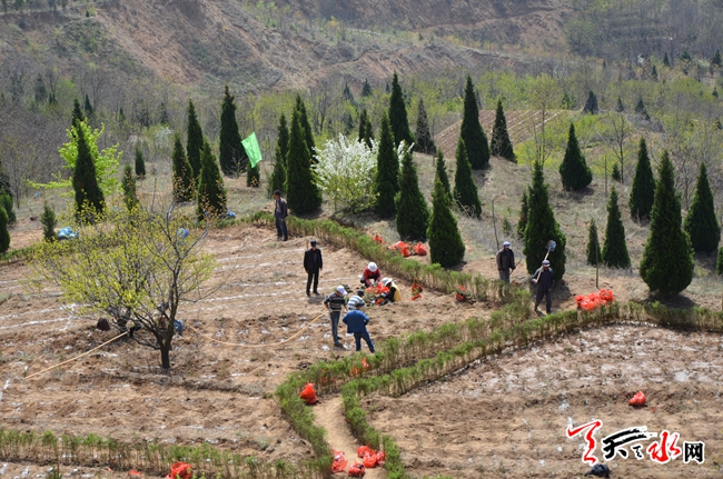 ▲4月18日,工人们正在天水成纪新城北山生态观园栽植花木。天水成纪新城北山生态观园提升改造工程位于花牛镇肖家庄北山,区域面积2009亩。工程按照“四季常青、三季有花、二季有果、春花秋实、绿美结合、应绿尽绿”的建设思路,采取增色、增绿、增花及生态修复措施,将天水成纪新城北山营造成一个山水相间,春绿更碧,秋黄冬青,风景如画的生态景区。工程于今年三月中旬开始建设,目前已接近尾声。(天水日报记者 王晓馨 摄)
