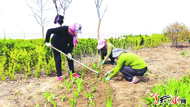 ▲4月20日,在甘谷县南滨河路东延改造及景观绿化工程现场,工人们正在重新补植鸢尾等绿化植物。该工程全长10.2公里,与正在建设的甘麦公路相接,工程总概算投资约4574万元,由城市文化广场、滨水道路风情带、自然景观生态绿化等项目构成。(天水日报记者 冯丽娟 摄)