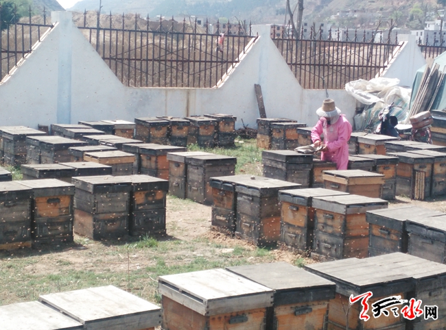 4月20日,秦州区太京镇窝驼村附近一名养蜂人正在忙碌着。近期气温回升较快,天水大地百花盛开,良好的生态环境吸引了养蜂人来这里放蜂。(天水日报记者 何郁 摄)