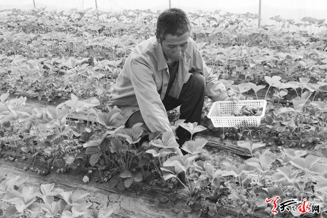 4月19日,清水县农业科技示范园区内,红堡镇的蔡义周正在大棚内采摘自己种植的草莓。