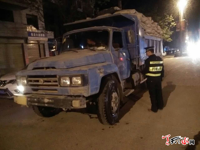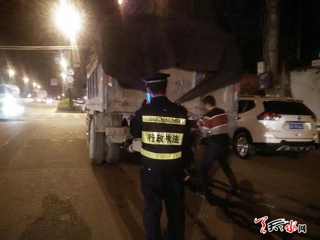 天天天水网讯【记者杨旭 通讯员苏炳录】大型运输车辆带泥上路、运输渣土遗撒等如不妥善处理,经过城市主要街道是将会对城市道路环境造成一定污染,同时也会造成扬尘对环境造成污染。4月20日晚,秦州区执法局联合环卫处、交警及运管部门组成联合执法组,对秦州城区范围内夜间渣土运输车辆进行集中整治,一经查处,将对其处以5000元至30000元罚款。