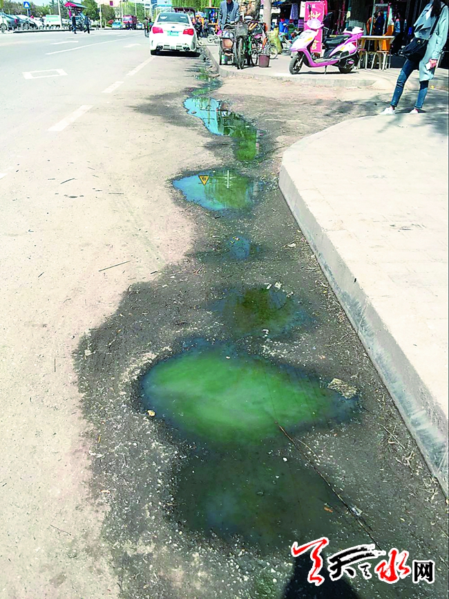 4月19日,记者途经麦积区成纪大道东路市八中附近时,一股恶臭味扑面而来。原来,市八中与天锻家园小区之间有一股长达十几米的污水积在路边的坑洼里,并且已经发绿。污水应该是附近的排污系统堵塞所致,此外,附近有一些摊贩也有泼倒脏水的行为。天气渐暖,希望有关部门能尽快维修排污系统,也希望附近摊贩不要乱倒脏水,共同维护市容环境。(记者 贾敏 摄)