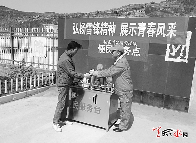 4月22日上午,庄天二级公路旁,张家川公路管理段的便民服务人员为过往司机提供开水。该段设立的便民利民服务点,为过往司乘人员免费提供开水、急救药品、简易修车、车辆加水、零时停车和政策咨询等便民服务,方便了公众出行。(王小强 摄)