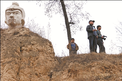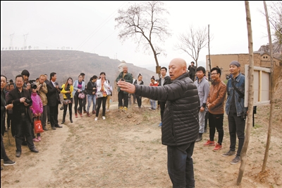 与艺术家交流如今成为石节子村村民的重要生活内容。4月4日,靳勒(右二)和助手一起在村口等待又一批从北京来的艺术家。