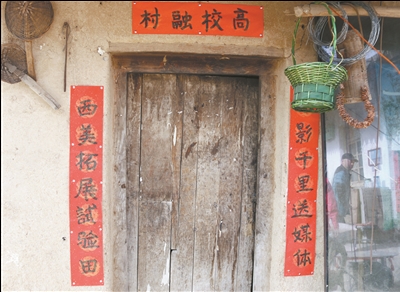 去年,北京电影学院、西安美术学院师生来石节子村办展览、搞创作。为此,靳勒把这样一幅春联贴在了自家厨房门口。