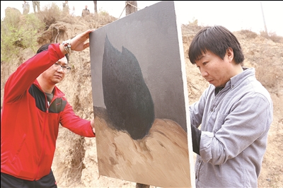 青年画家闫冰(右)正在石节子村布置个人画展,画作就挂在土墙、荒坡和树上。