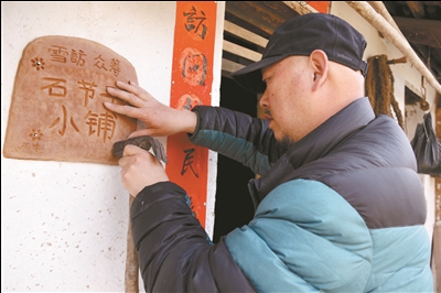 石节子村的小卖部开业了,靳勒在往墙上钉店铺招牌。