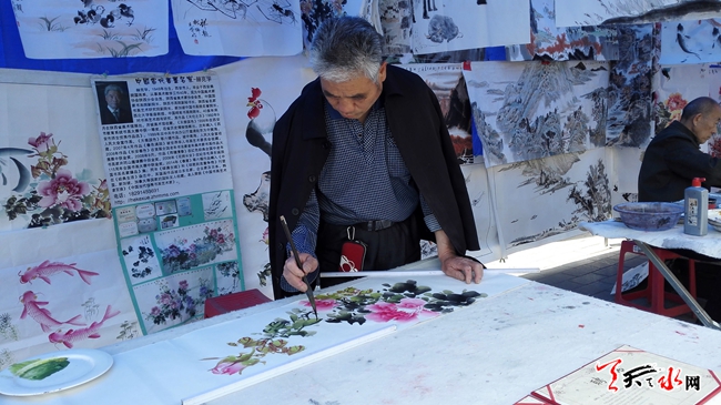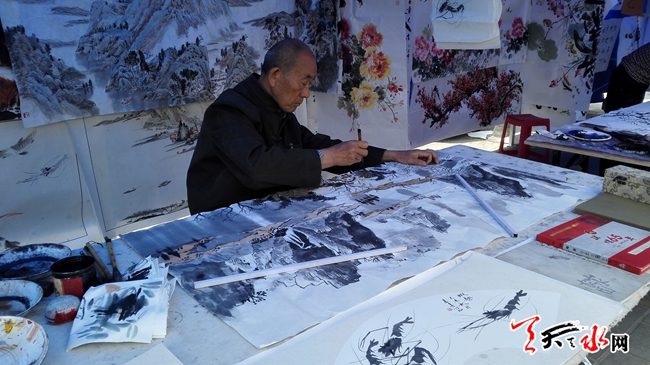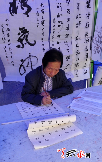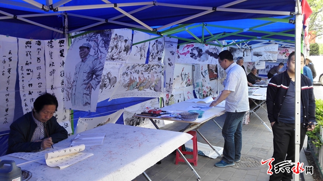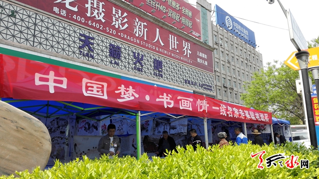 天天天水网26日11时讯【记者 杨旭 王明辉】4月26日,在秦州区自治巷口,中国梦•书画情一线名家在此挥毫泼墨,正在开展走基层书画展活动。记者在现场看到,过往市民纷纷驻足观看,欣赏佳作。