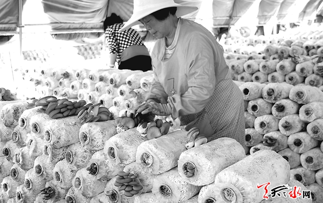 4月24日,工人正在麦积区兴农友农民专业合作社日光棚里采摘蘑菇。该合作社位于花牛镇白家河村,占地46亩,主要生产香菇、茶树菇、蘑菇、海鲜菇、鸡腿菇等食用菌,产品供不应求。在自身发展的同时该合作社带动村里43户贫困户加入合作社,用入股分红、产业帮扶等方式帮助他们脱贫致富。(特约记者 尤斌 摄)