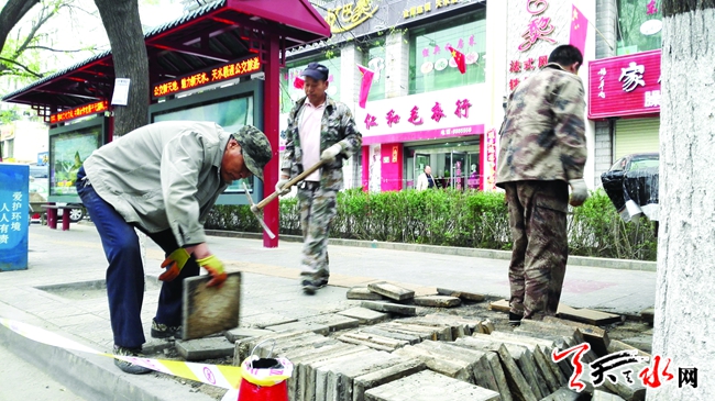 4月25日上午,毛师傅等几位建筑工人正在秦州区新华路天水长途车站前的人行道上整修地砖。