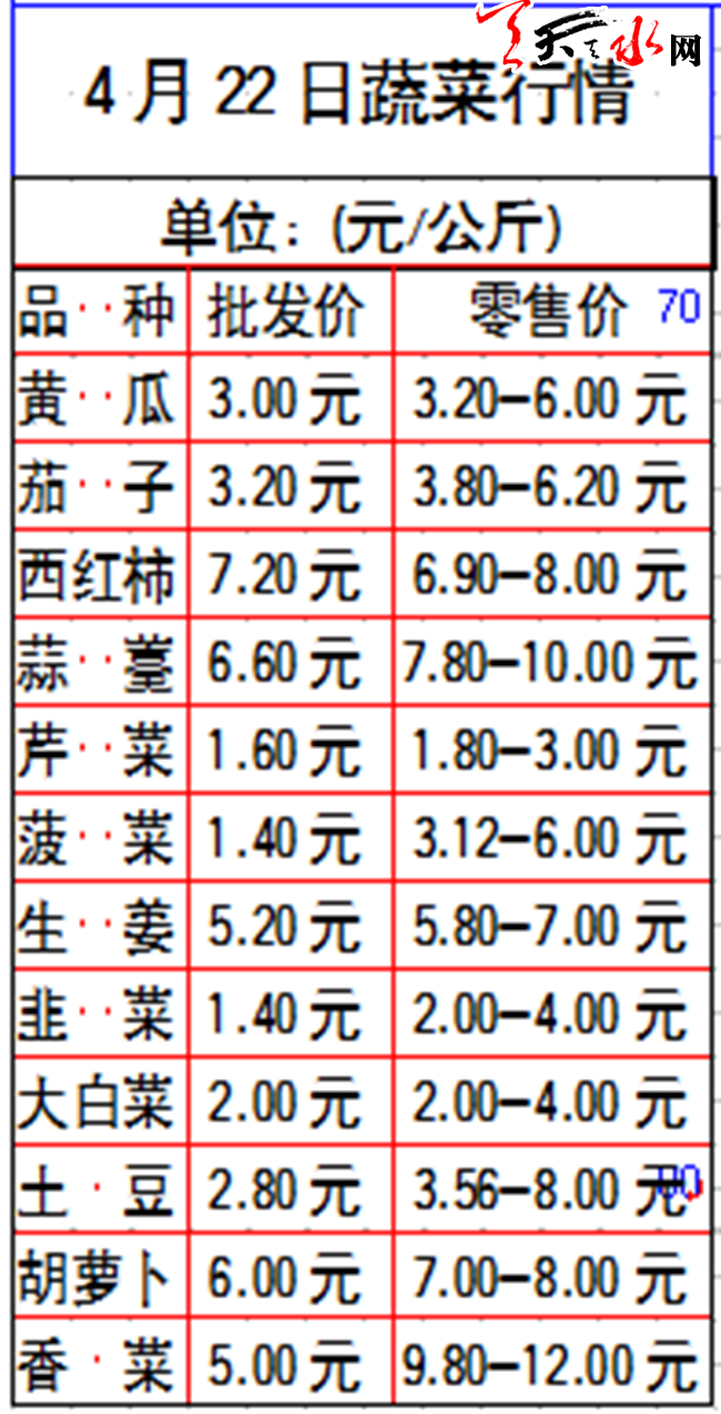来自天水瀛池果菜批发市场的统计数据显示:和4月15日相比,22日蔬菜的批发价有跌有涨,其中土豆、茄子的批发价保持平稳,黄瓜、西红柿、生姜、胡萝卜和香菜的批发价涨了,而蒜薹、芹菜、菠菜、韭菜、大白菜的批发价降了。从零售价来看,上述菜品中,西红柿、胡萝卜和香菜的价格上扬明显,黄瓜降了点,其他菜品“稳”字当头。