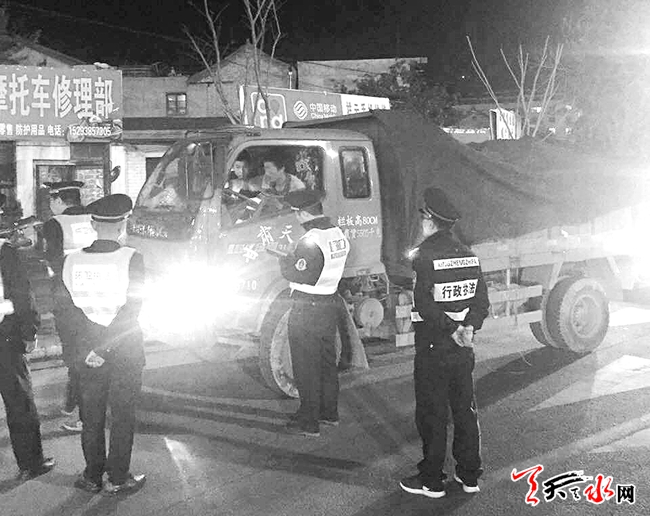 4月24日夜间,秦州区综合执法、环卫、交警、运管等部门联合执法,设多个检查点,对城区范围内夜间运输渣土的车辆进行集中整治,尤其对遗撒渣土、运输扬尘物品不遮盖密封、带泥上路污染路面等违章行为进行清查治理,进一步规范运输行为。