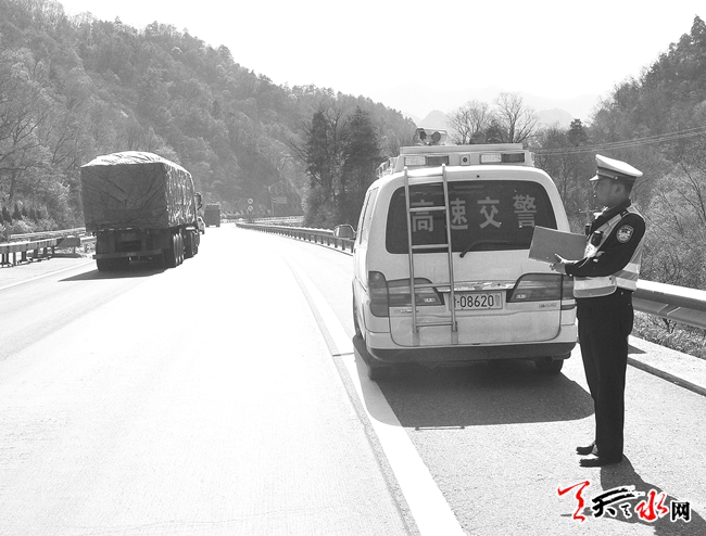今年第一季度,宝天高速秦岭关隧道西出口100米处路段就发生了多起交通事故,经排查,该路段急弯陡坡,恶劣天气路面湿滑,极易造成车辆侧翻,而路面缺少防滑沙及其他防滑设施,未设置弯道下坡和冰雪路面提示牌。针对该路段隐患,大队向有关部门发放《道路交通安全隐患整改通知书》,完善恶劣天气处置预案等,及时消除安全隐患,确保行车安全。(记者 王晓华 摄)