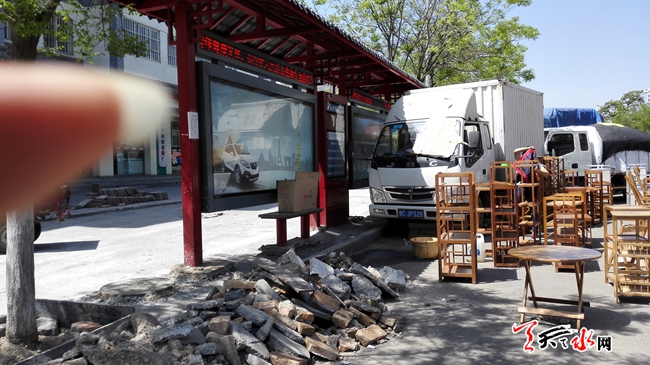 天天天水网28日17时讯 【记者 何永德】4月28日,位于秦州区坚家河花鸟市场的18路公交车站被摆放的摊位和随意停放的车辆所侵占,乘客根本无法在新建的候车棚下候车,据了解,靠近花鸟市场的18路公交车站,经常被各种摊位挤占,希望相关部门还候车棚于乘客。