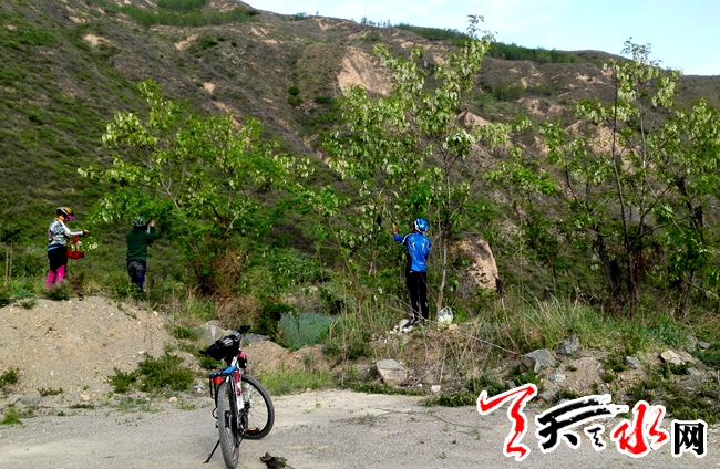 天天天水网1日13时讯(记者苏中豹)5月1日下午,在麦积区下曲湾的山坡上,有骑行驴友在釆摘槐花,还有人停车路边翻越围栏釆摘路边行道树上的槐花。