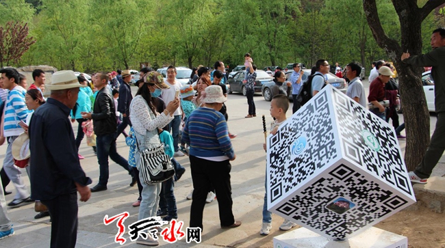 游客在旋转立方体二维码前拍照