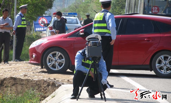 交警在设置违章车辆抓拍设备