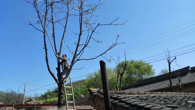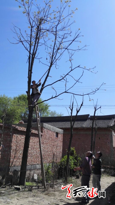 天天天水网3日14时讯【记者 张文都】立夏将至,各种时令蔬菜光鲜上市,以满足人们的口腹之欲。5月3日,秦州区平南镇,采摘者攀爬在高大的香椿树干上,艰难地采摘那一簇簇粉红色的嫰芽。
