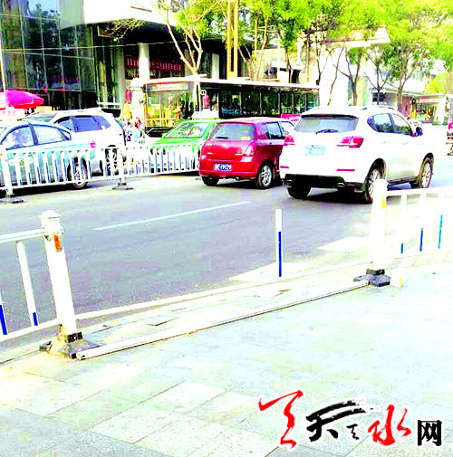 4月29日,记者在秦州区建设路看到,位于市建二小学对面公交车站附近的这处人行道护栏,由于经常被在此等车的学生攀爬、倚靠,而导致护栏栏杆断裂,最终被解体毁坏。人行道护栏作为城市公交设施,是城市交通安全的一道屏障,需要大家都来爱护。在此,呼吁学校及家长都能教育自己的孩子尽量不要去破坏护栏。