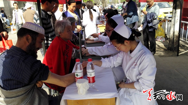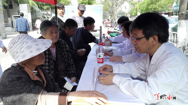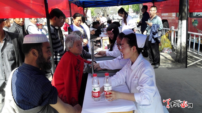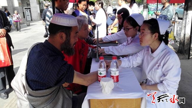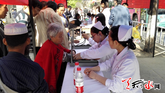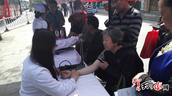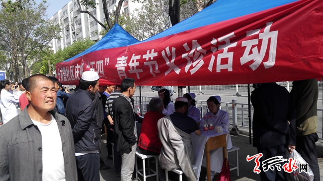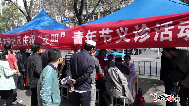 天天天水网4日10时讯 【记者 杨晓斌】记者路过秦州区东桥头时看到东关街道办事处十方堂社区为庆祝五四青年节,组织医卫人员在东升大厦附近进行义诊活动,义诊点上前来咨询诊疗体检的人员熙来攘往,诊疗点上医卫人员严谨中不失谦和,认真热情的接待过往来客。