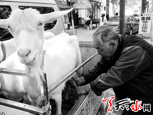 5月4日,一位老人拉着奶羊在秦州区忠武巷出售现挤羊奶。牵羊现场挤奶出售,会让人觉得羊奶很新鲜、很纯正,但不戴手套的“徒手”挤奶,不知是否卫生。建议市民们把羊奶带回家煮沸饮用,有一定的杀菌作用。