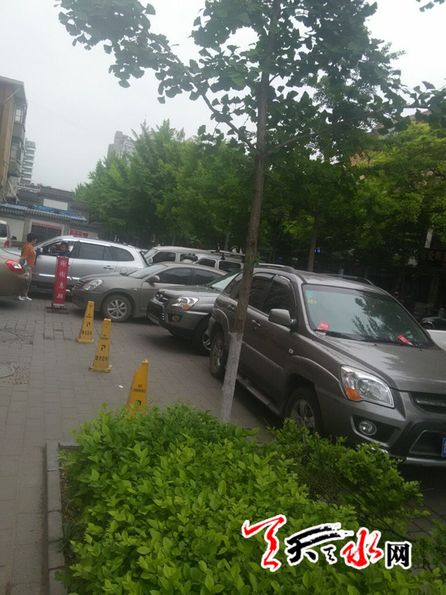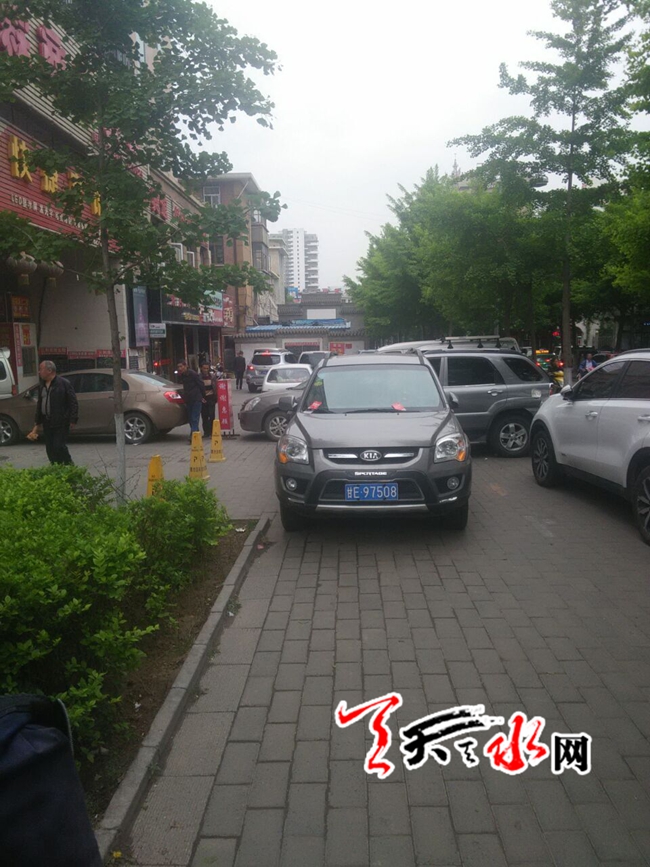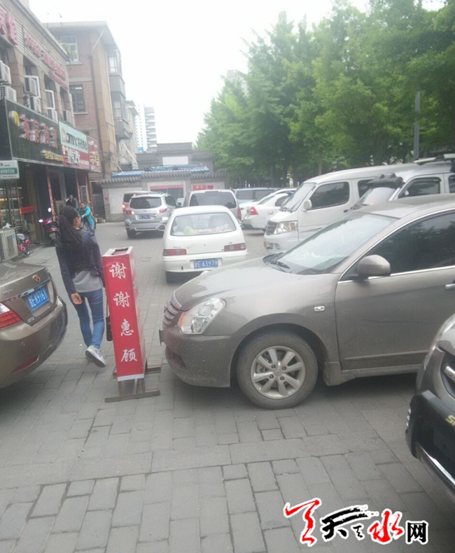 天天天水网6日11时讯【记者 何慧娟】5月6日上午11时左右,记者途径秦州区青年北路时看到,本来比较宽阔的人行道上,横七竖八地停着不少私家车,它们占据了主要道路,过往行人也只能在车辆缝隙中穿梭。天天天水网提醒司机朋友,规范停车,安全行人!