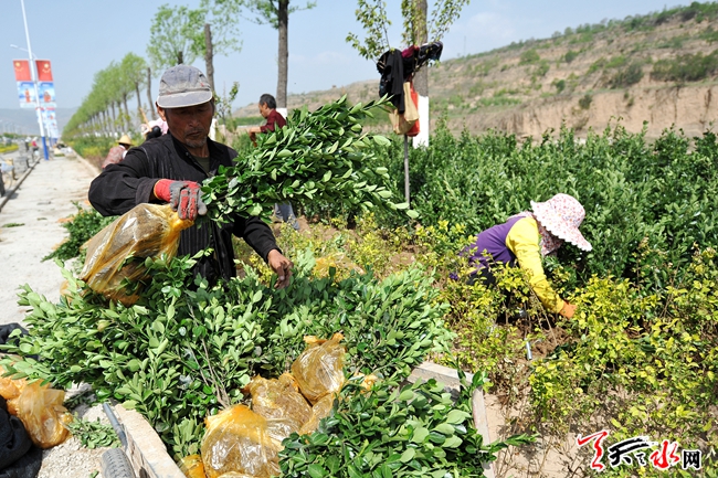 5月5日,工人们在清水县上邽大道北侧绿化带栽植冬青树。今年以来,清水县以开展“六城联创”活动为契机,结合创建园林城市要求,抢抓春夏季节植树造绿的有利时机,以环境绿化美化为重点,持续对原有绿化设施进行整治,大力实施城区绿化工程建设,确保高质量、高标准完成今年园林绿化建设任务。(天水日报记者 周文涛 孙镇 摄)