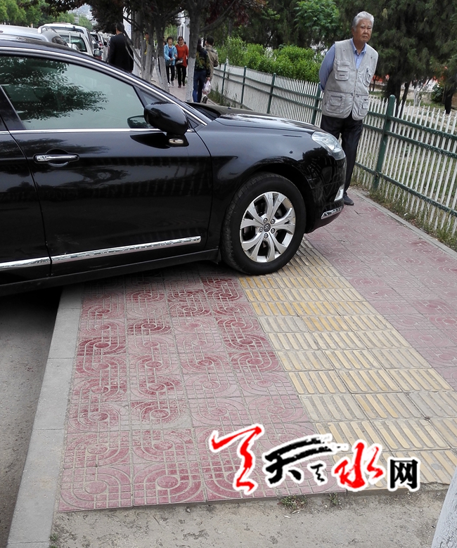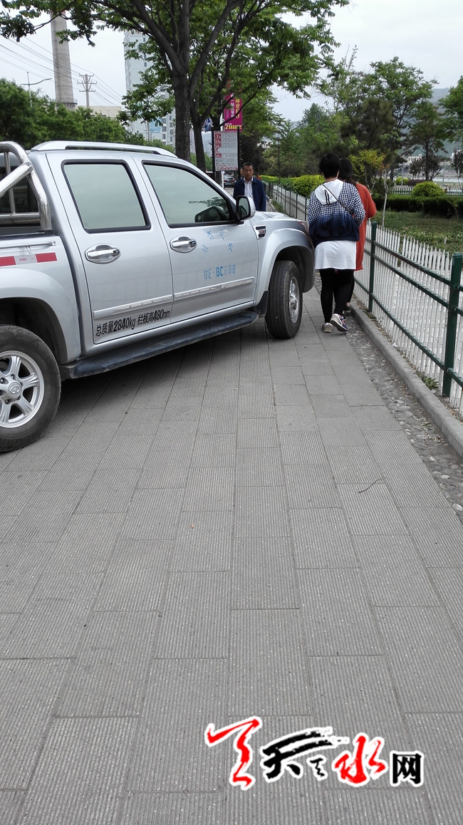 天天天水网7日12时讯 【记者 何永德】5月7日上午,藉河北路西段城区交警队附近人行道上,相隔不远的两辆机动车横停放在人行道上,严重影响了行人的正常通行,希望相关部门禁止这种霸道的不文明停车行为。