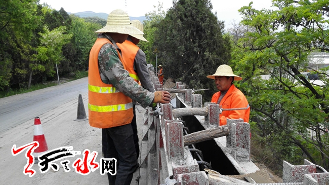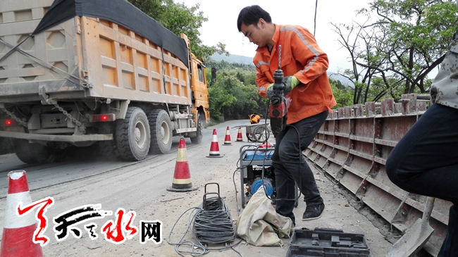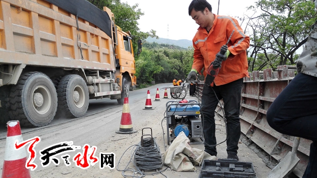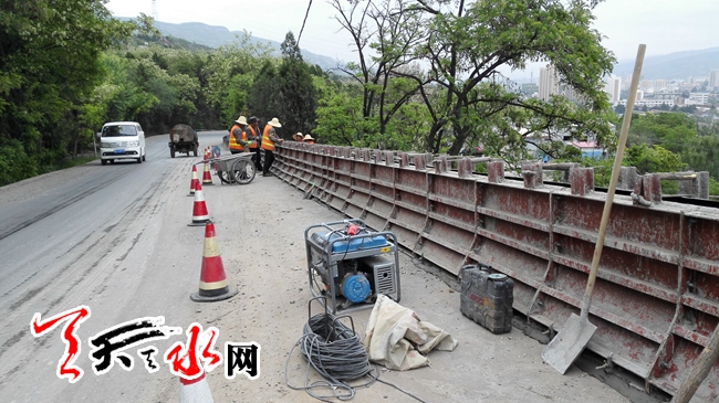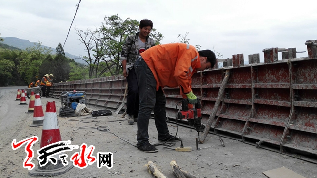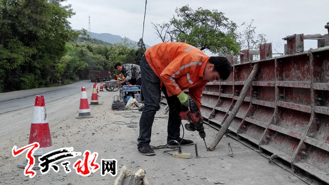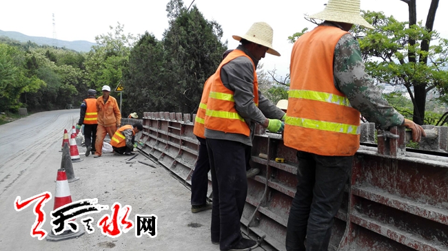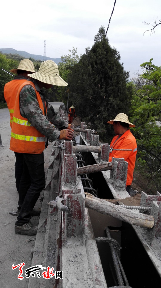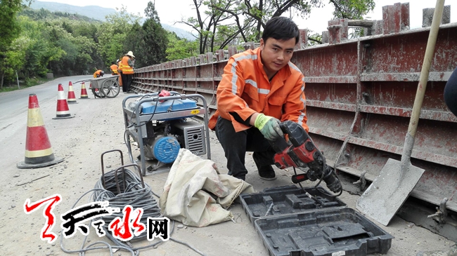 天天天水网8日12时讯【记者 苏中豹】5月8日中午,省道207秦州区皇城山段,建筑工人们正在道路一侧紧张施工,修筑防撞护栏。
